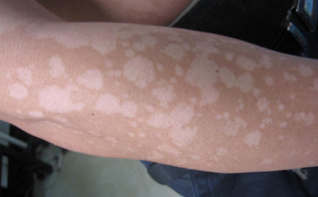 皮损常见于胸、背、臂和颈部。其他有面部、腹部、臀部、腋窝、腹股沟、头皮、枕部等。常夏秋加重,冬季减轻或消退。开始为细小斑点。患者常不自觉,渐成粟米、黄豆至蚕豆大小圆形或类圆形斑疹。边缘清楚,与皮肤持平或微微高起。表面覆以极薄糠秕样鳞屑,有光泽,尤其是对光侧看时,皮损表面反光性强。新皮损色深,呈灰色、黄色、棕色、淡褐色或褐色。老皮损色淡发白。新老皮损同存时,黑白间杂呈花斑状,颇具特征性,为花斑癣的典型表现。当除去鳞屑或皮损治疗可以时,遗有暂时性的色素减退斑,患者常误认为患有白癜风而前来就医。