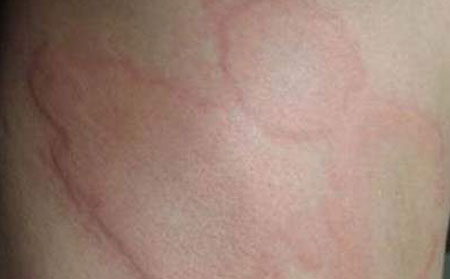 这种皮肤抓过出现线状膨疹,能在皮肤上写字的现象,称之为“皮肤划纹症”,也是物理性荨麻疹最常见的表现症状。皮肤通常在被抓过几分钟内就会出现“皮肤划纹症”,15~30分钟后逐渐褪去,但也有少数延迟性表现,症状在几个小时后才出现,且要持续1~2天才会褪去。